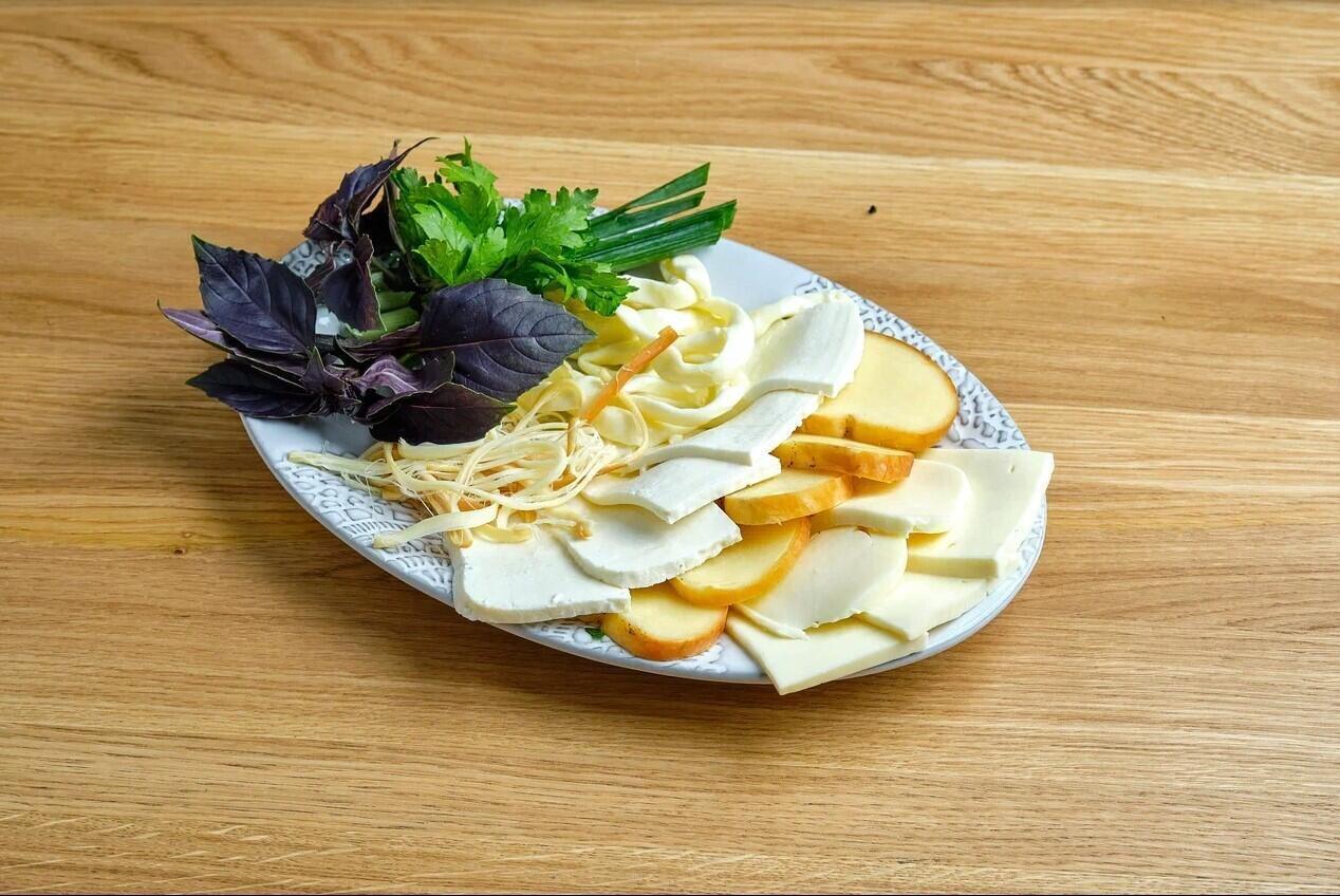 Сыр сулугуни, сыр сулугуни копченый, сыр сулугуни чечил, сыр сулугуни чечил копченый, сыр имеретинский, кинза, тархун, базилик красный, лук зеленый, цицмати.