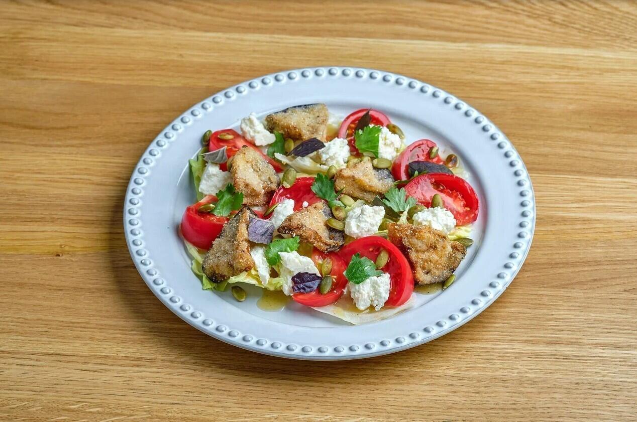 Баклажан, крахмал кукурузный, кукурузная мука, масло растителное, сыр надуги, помидор свежий, семечки тыквенные, кинза, базилик красный, салат айсберг, соус соевый, мед цветочный, уксус винный, перец черный молотый.