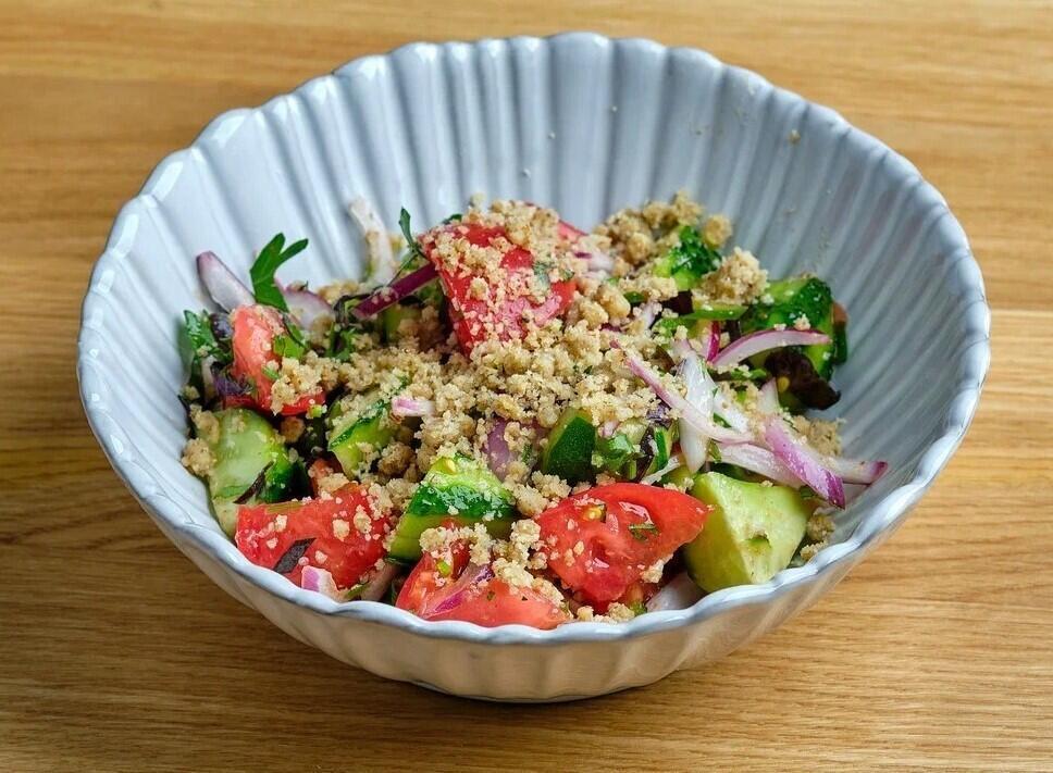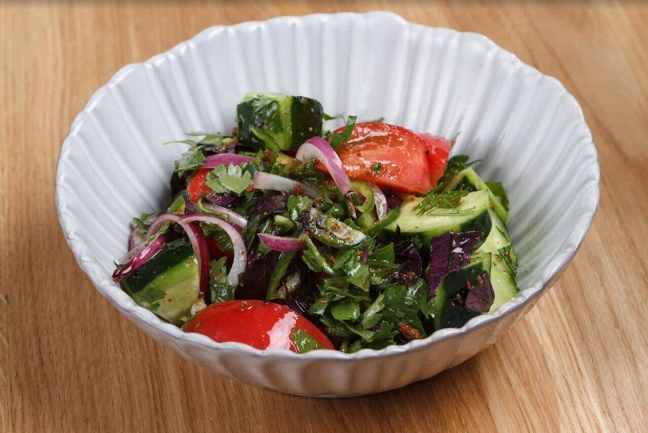 Помидор свежий, огурец свежий, лук красный, перец чили зеленый, лук красный, соль сванская, масло кахетинское, петрушка, кинза, базилик красный.