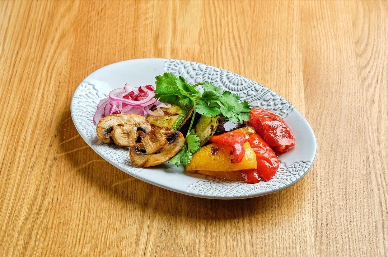 Перец болгарский, цукини, баклажан, томат, шампиньоны. Подаются с зеленью, красным луком и зернами граната.